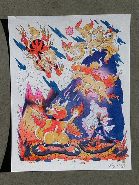 This is a three color Risograph print inspired by Pokemon, consisting of three layers, yellow, scarlet red, and blue.