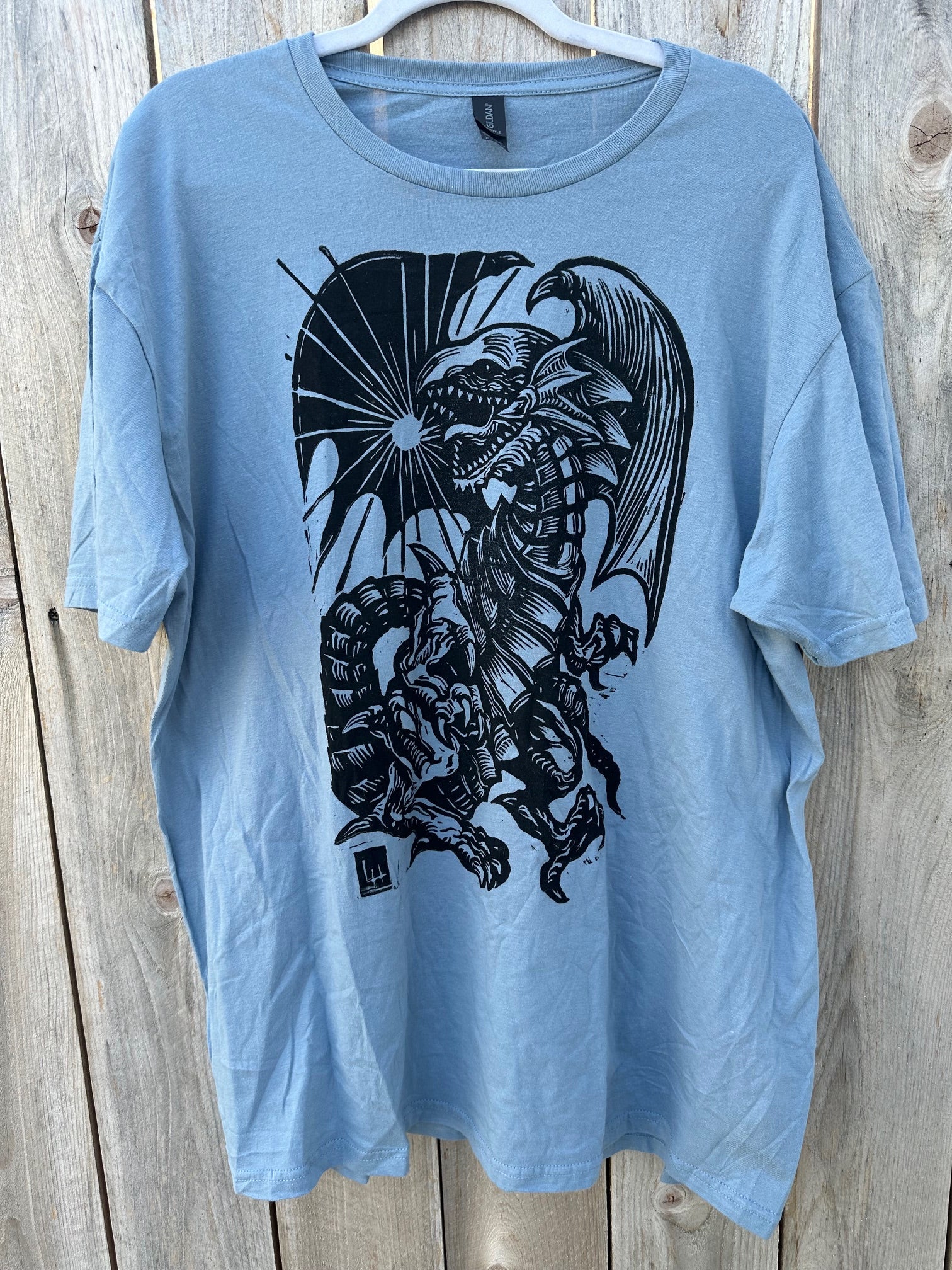 The legendary Blue Eyes White Dragon from Yu-Gi-Oh! graces the merch of Lanny Ho.