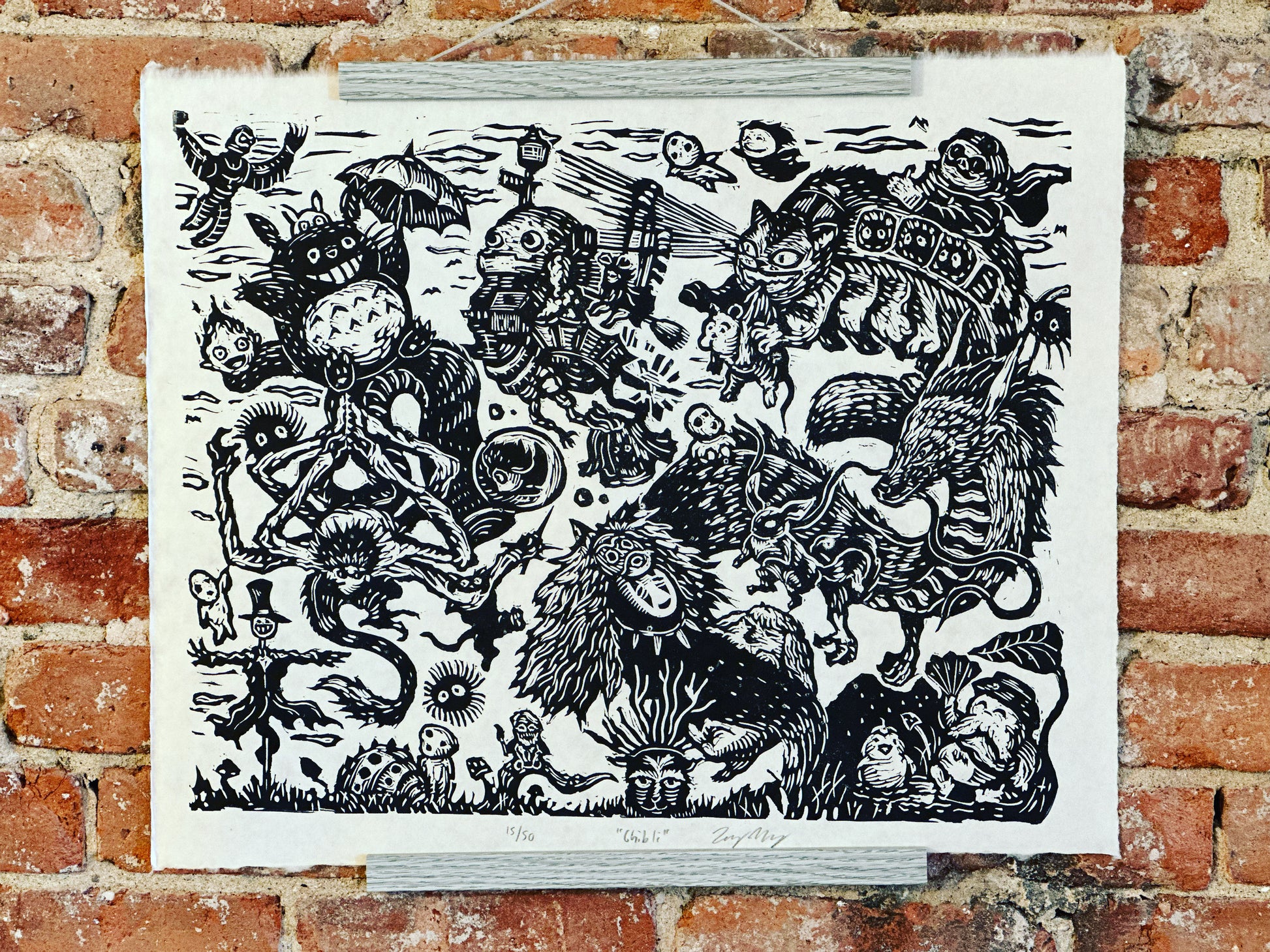Hand printed on ~17x20" 30gsm kitakata rice paper. Signed and numbered edition of 30.