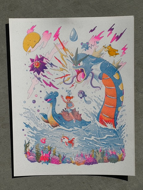 This is a three color Risograph print inspired by Pokemon, consisting of three layers, yellow, scarlet red, and blue.