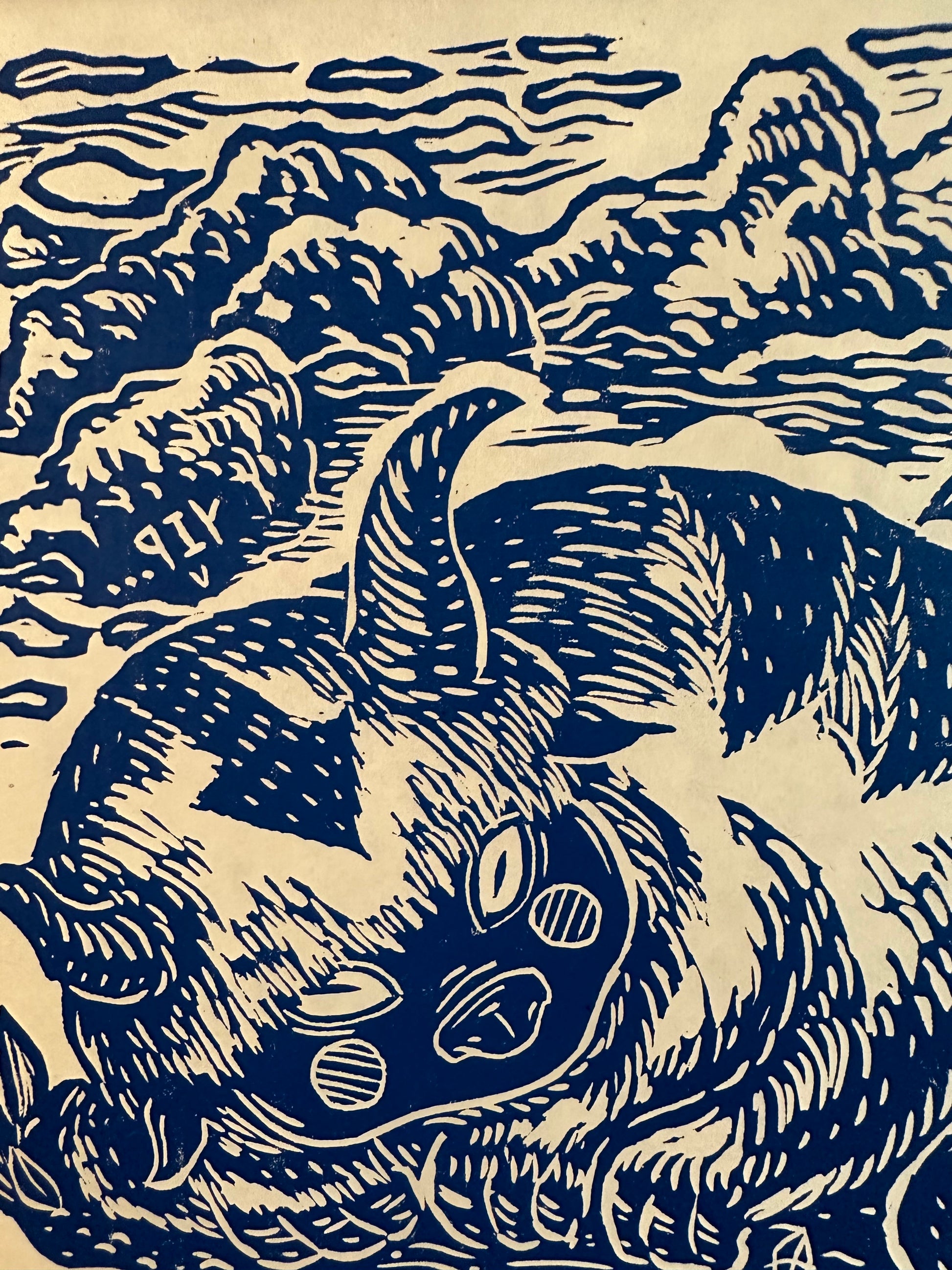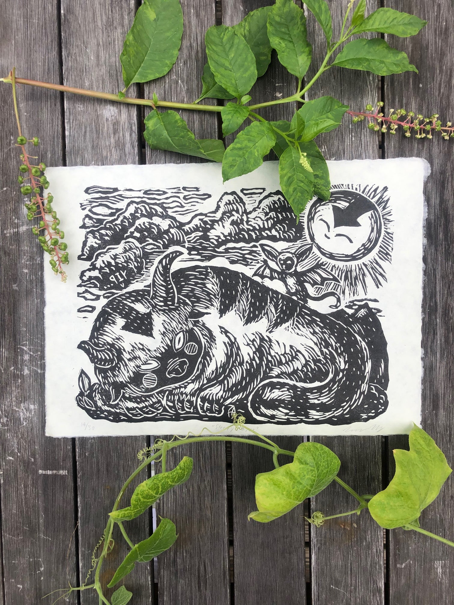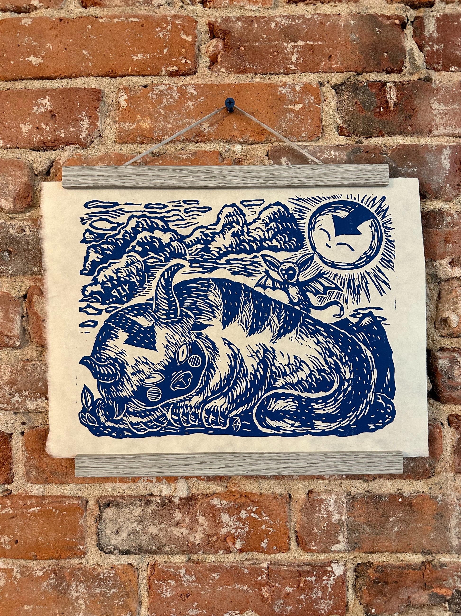 Appa returns this time as a linocut print! After a long day, Appa takes a nap with his buddy Momo watching over him.