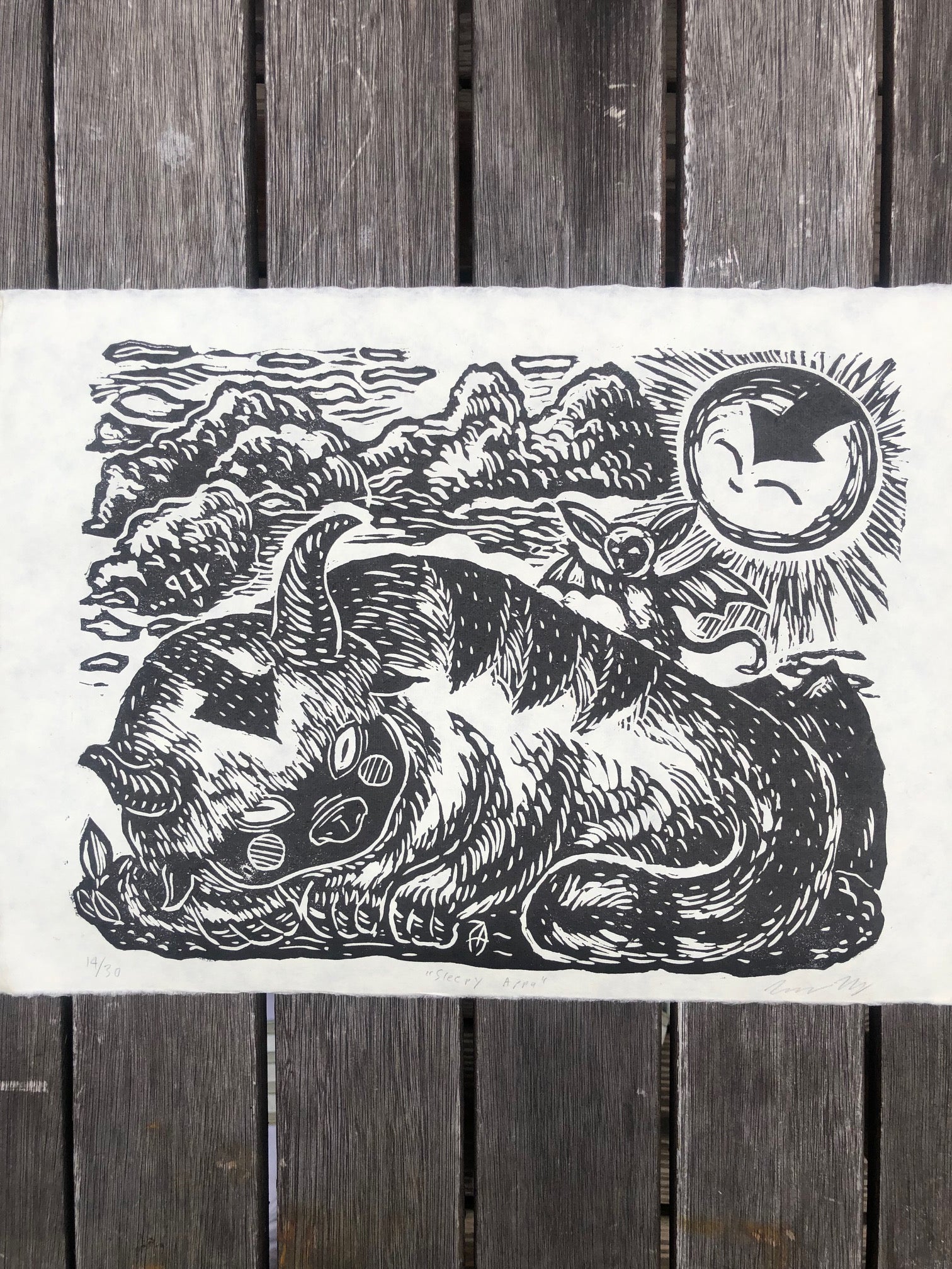 Hand printed on ~10.25x14" 30gsm kitakata rice paper. Signed and numbered edition of 40.