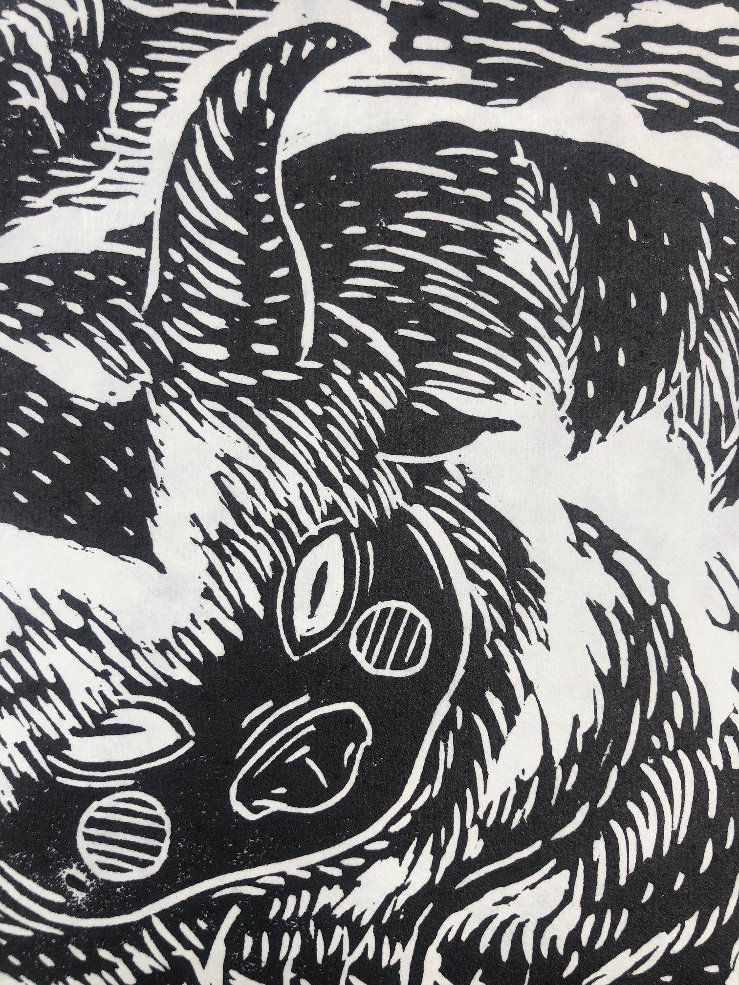 Every detail is carefully and meticulously hand carved into the woodblock. The block is then laid down onto paper and pressure is applied, treating the block as a large stamp. The result is a beautiful print showcasing the beauty of the marks carved into the wood.