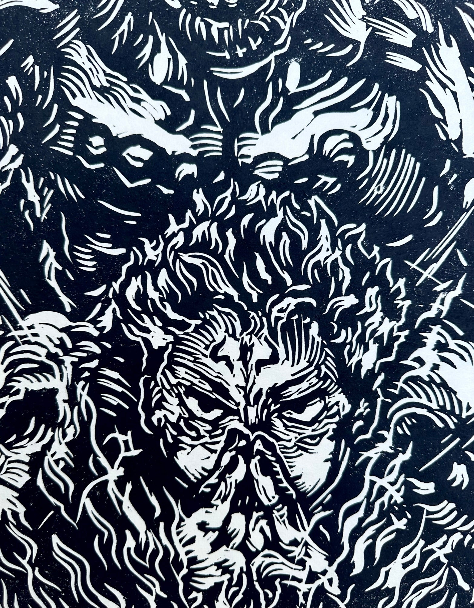 Hand carved linocut print of Sukuna and Mahoraga down in Sukuna's Domain.